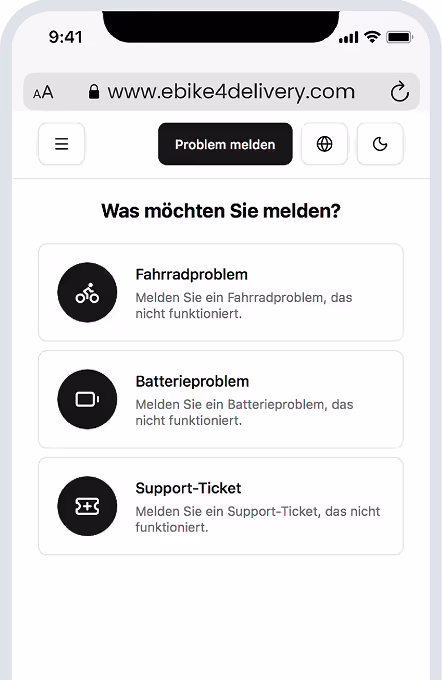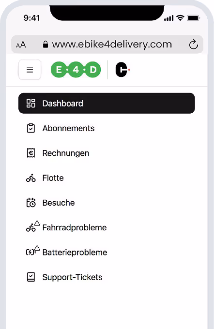 Fordern Sie den Service einfach an über die Ebike4Delivery Kundenportal, Melden Sie Probleme, planen Sie Wartungsarbeiten oder protokollieren Sie Schäden — jederzeit und von jedem Gerät aus.